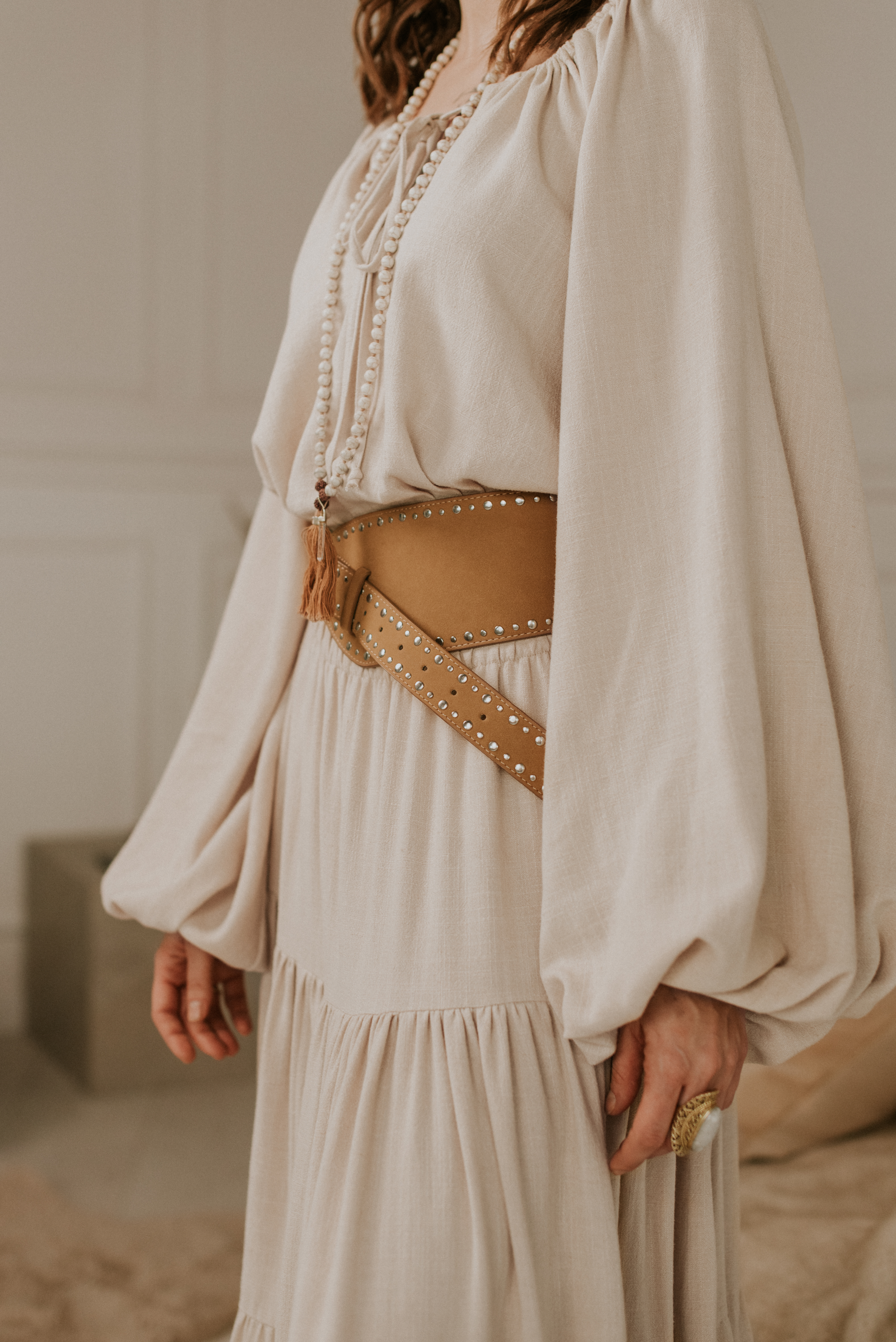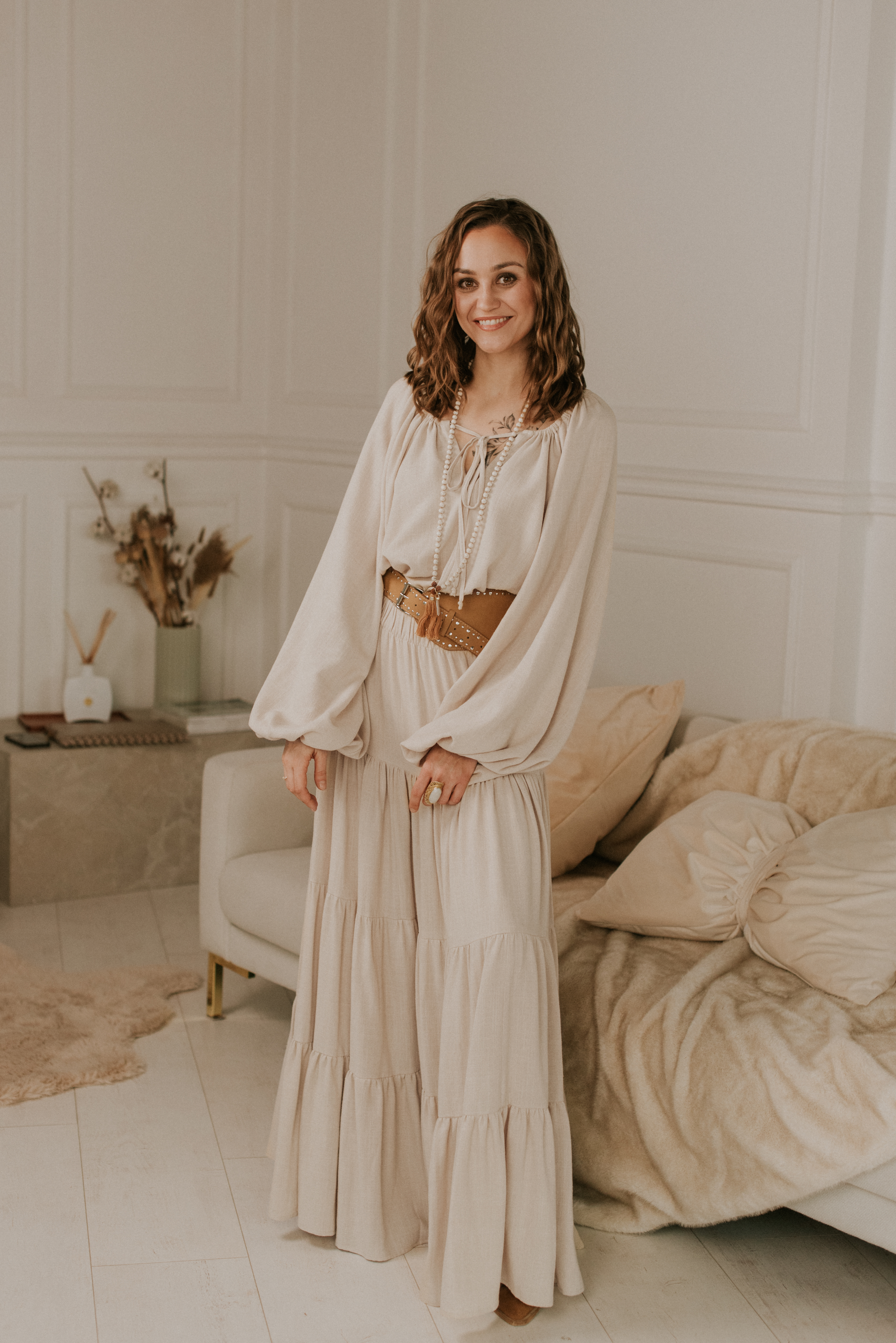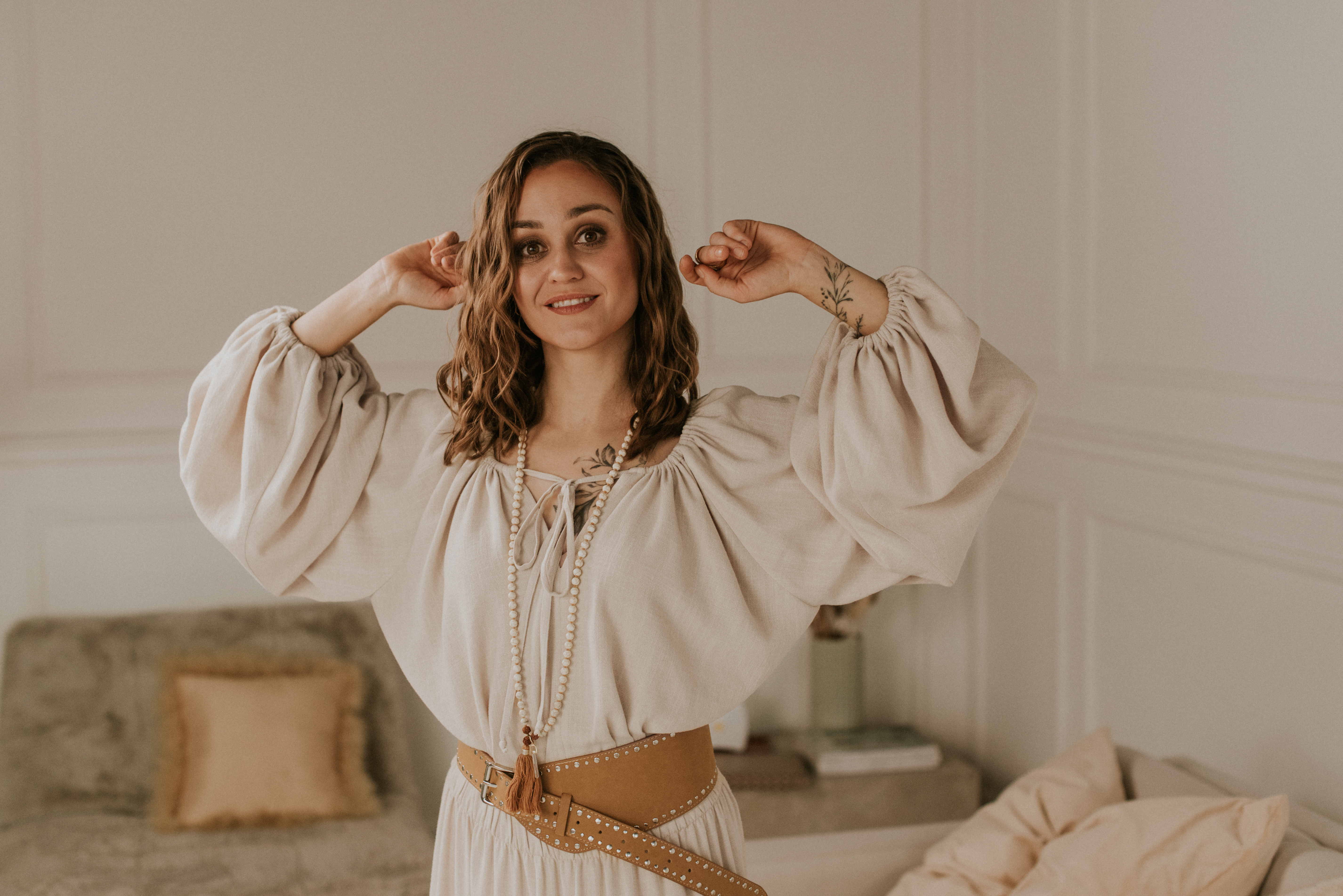 Bluzka Dea to ulubieniec wszystkich boho sióstr. Bufiaste rękawy, troczki, które można zawiązać lub puścić luźno, by otworzyć bluzkę. Można ją nosić luźno, ściągniętą na dole lub wpuszczoną do spodni czy maxi spódnicy.
