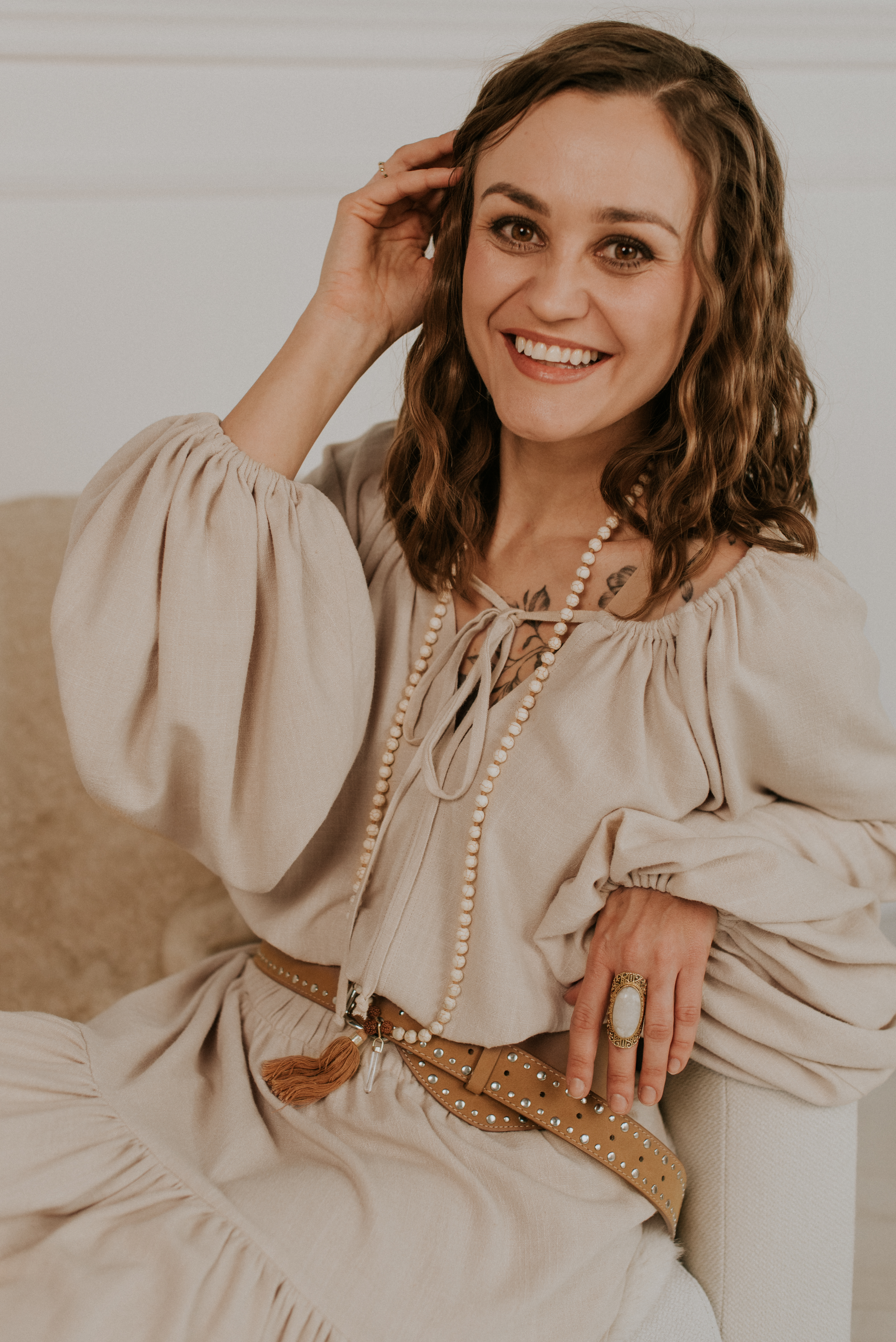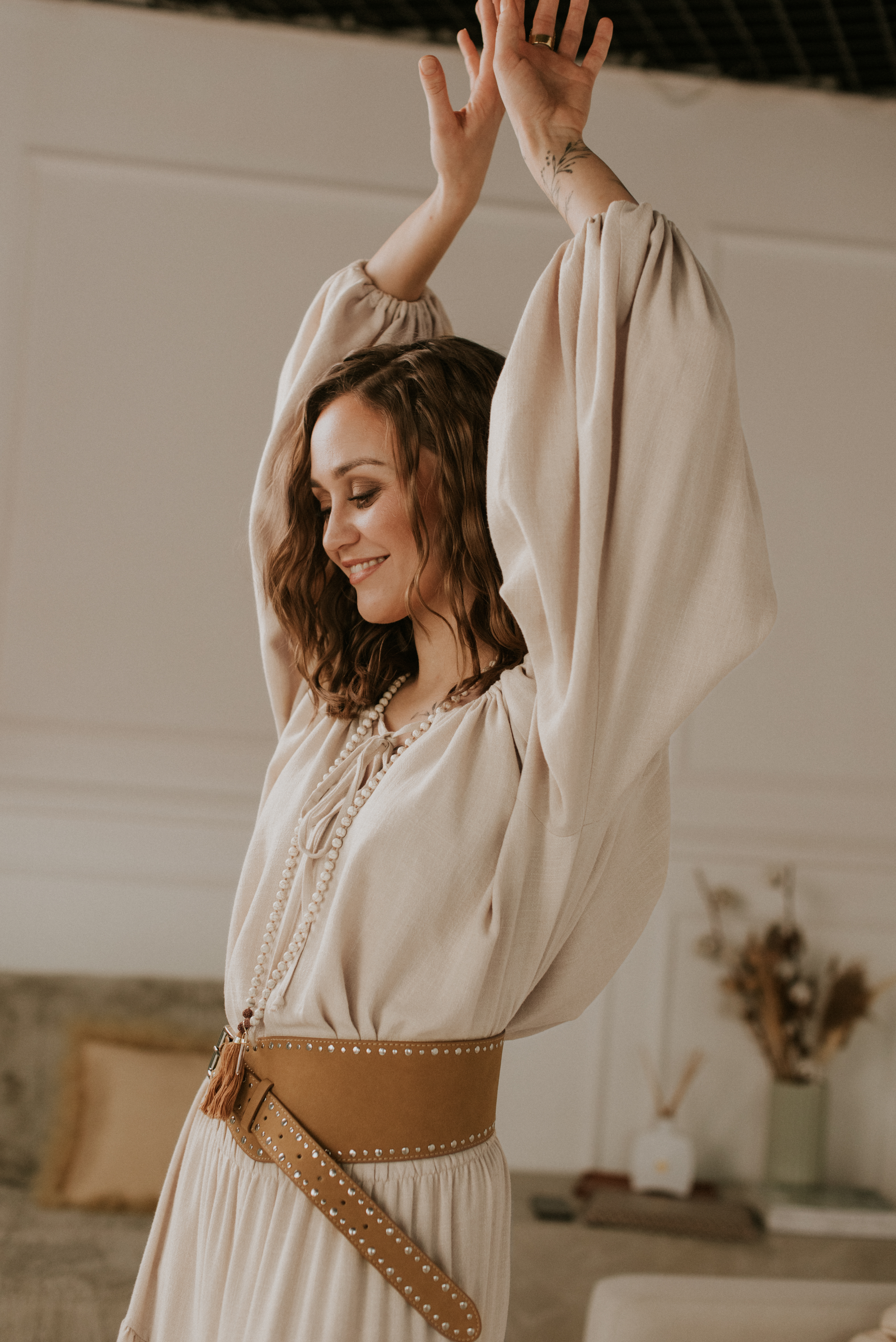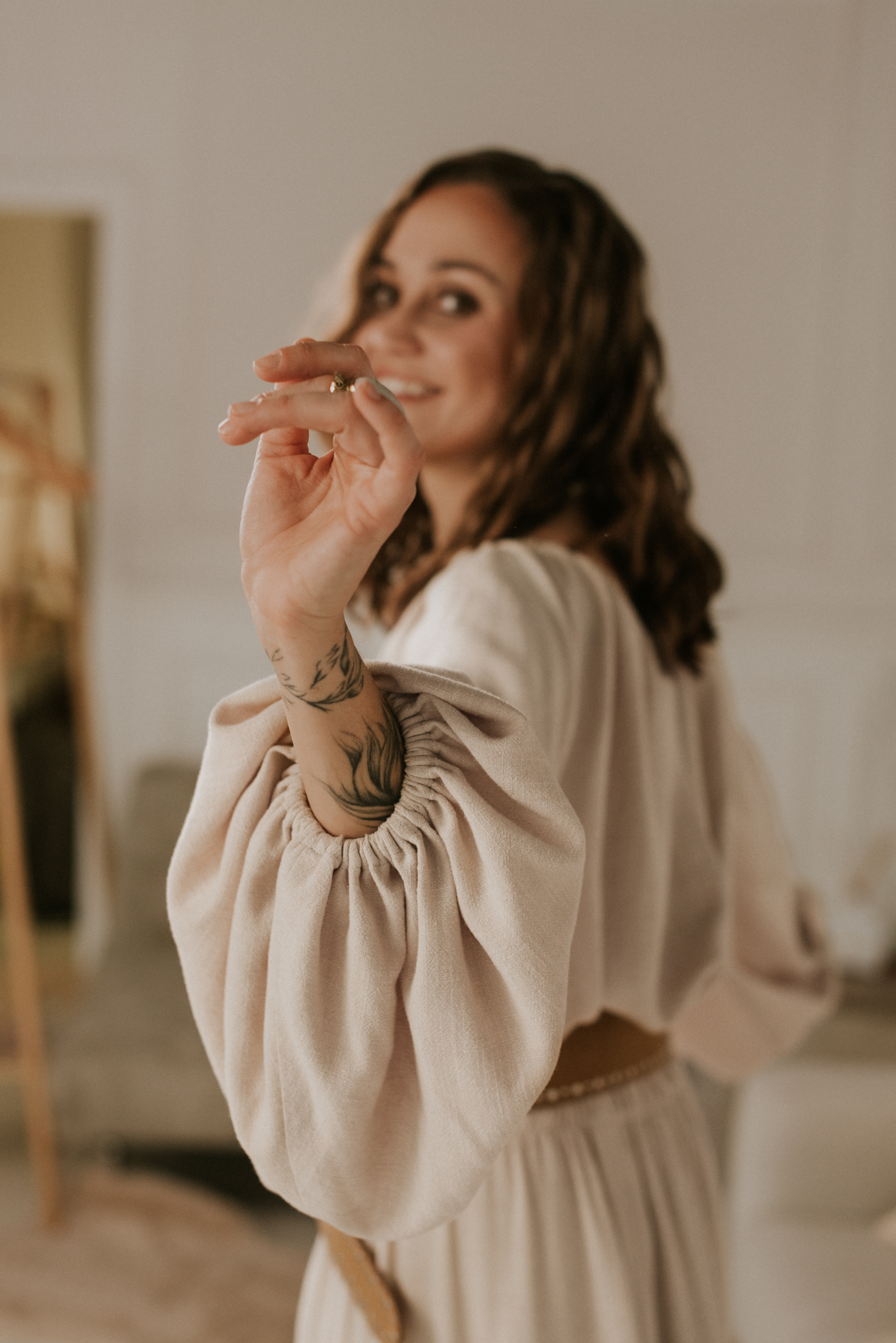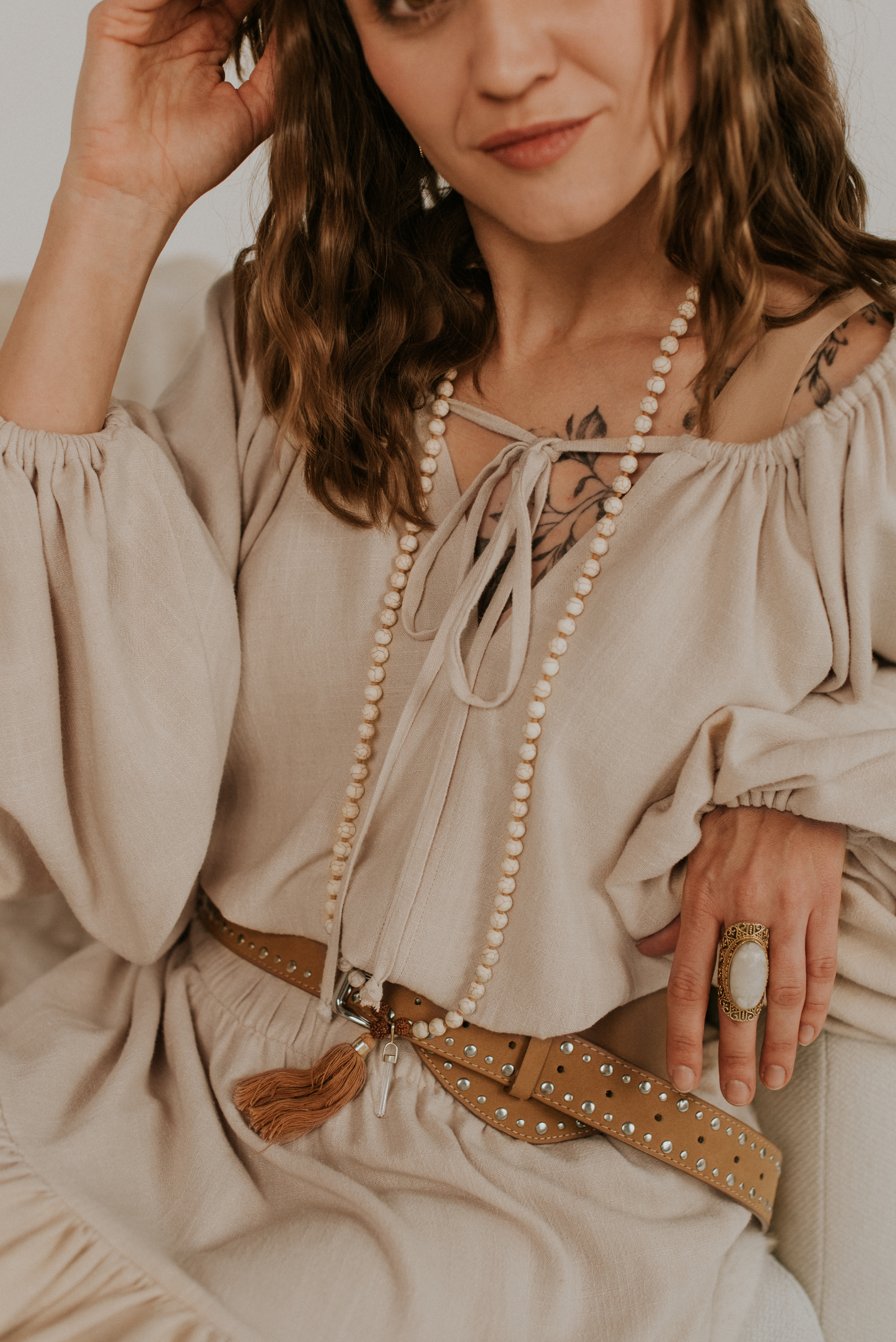 Bluzka Dea to ulubieniec wszystkich boho sióstr. Bufiaste rękawy, troczki, które można zawiązać lub puścić luźno, by otworzyć bluzkę. Można ją nosić luźno, ściągniętą na dole lub wpuszczoną do spodni czy maxi spódnicy.