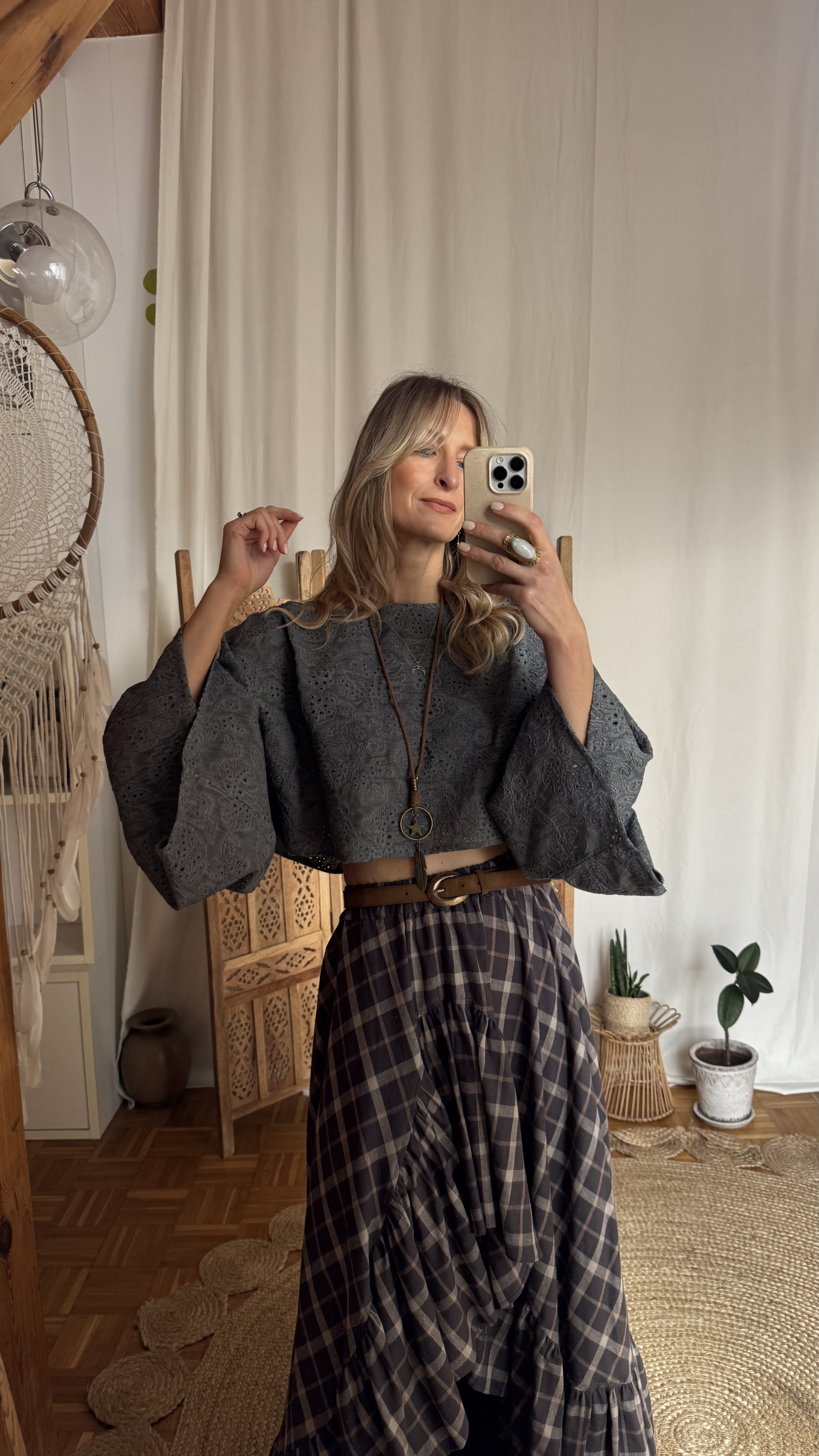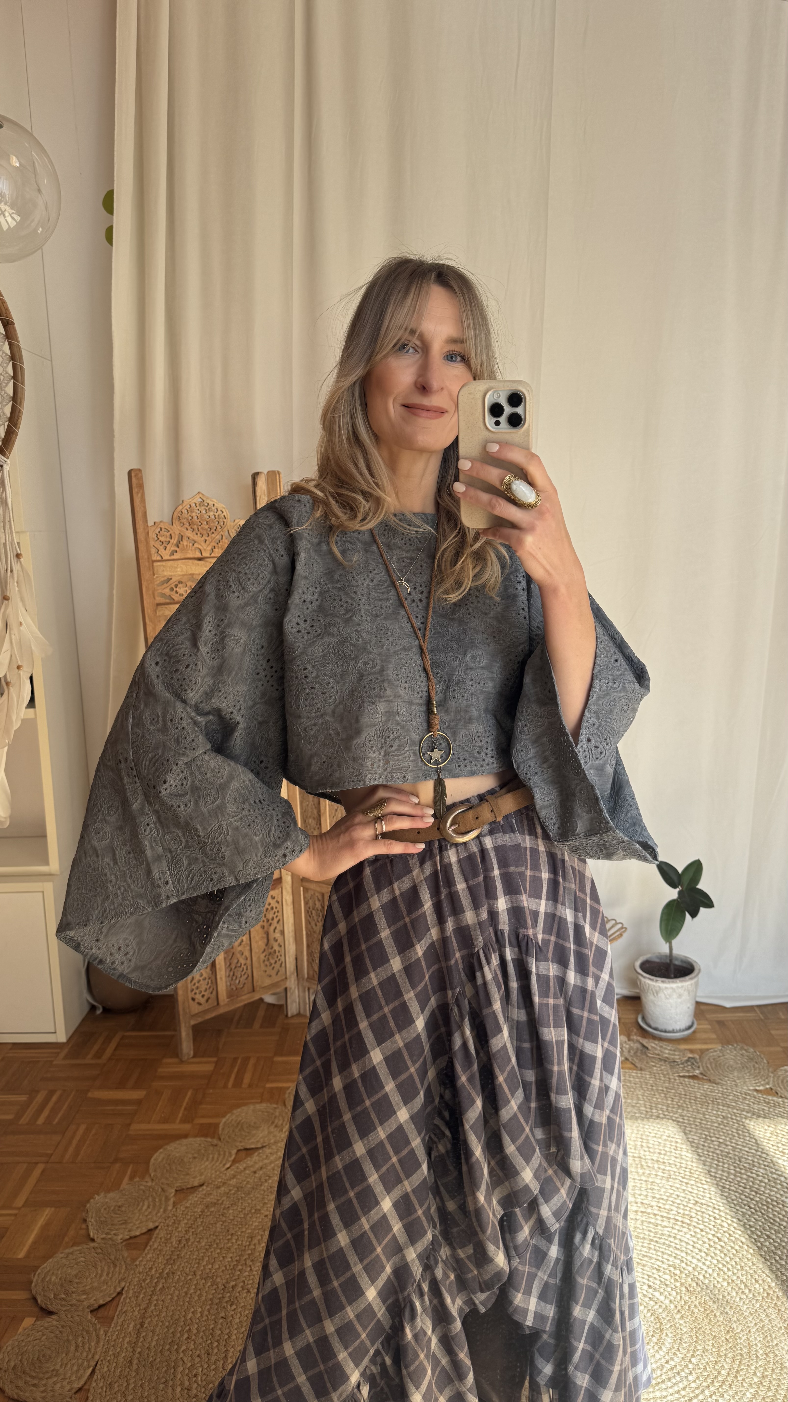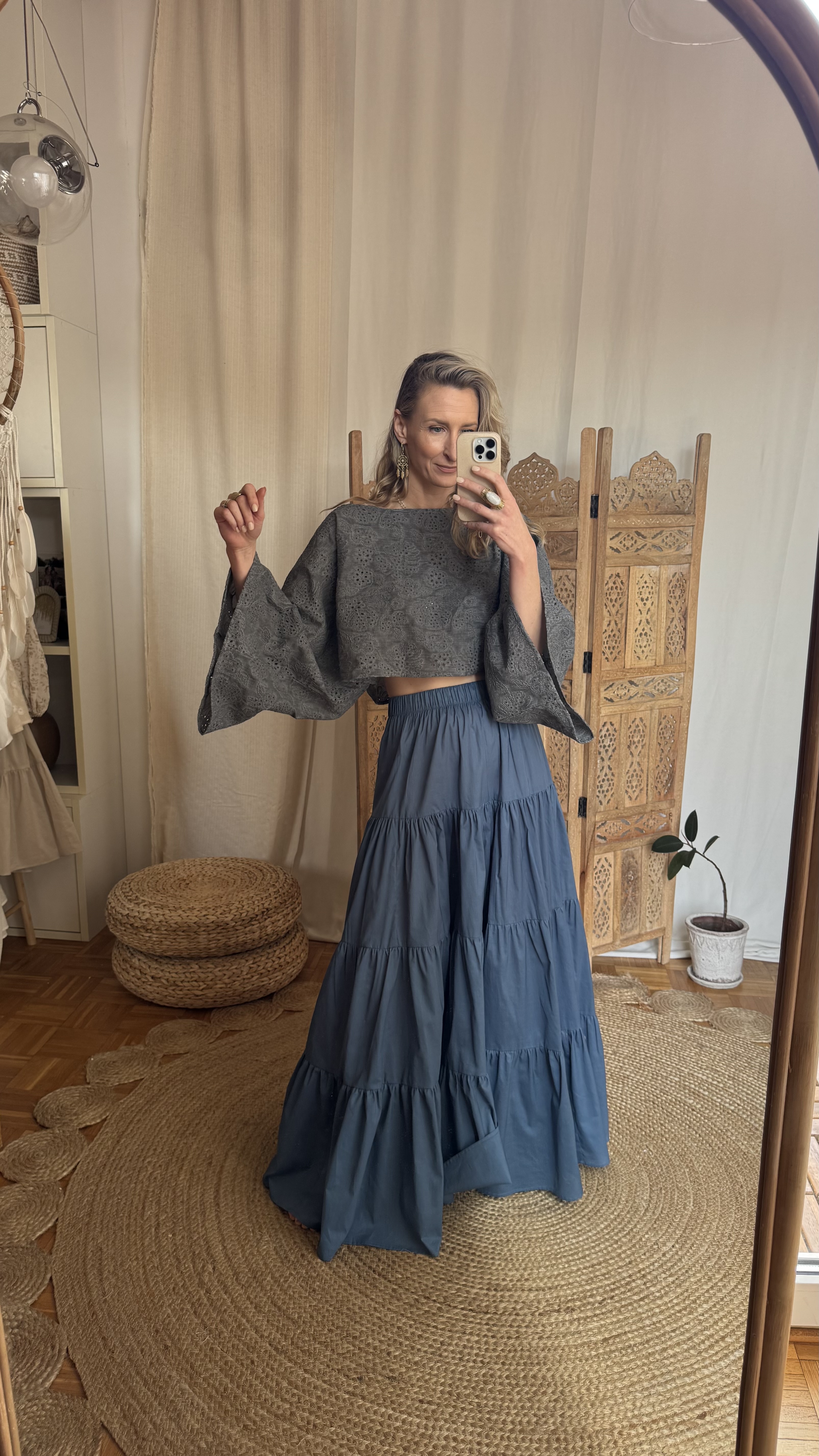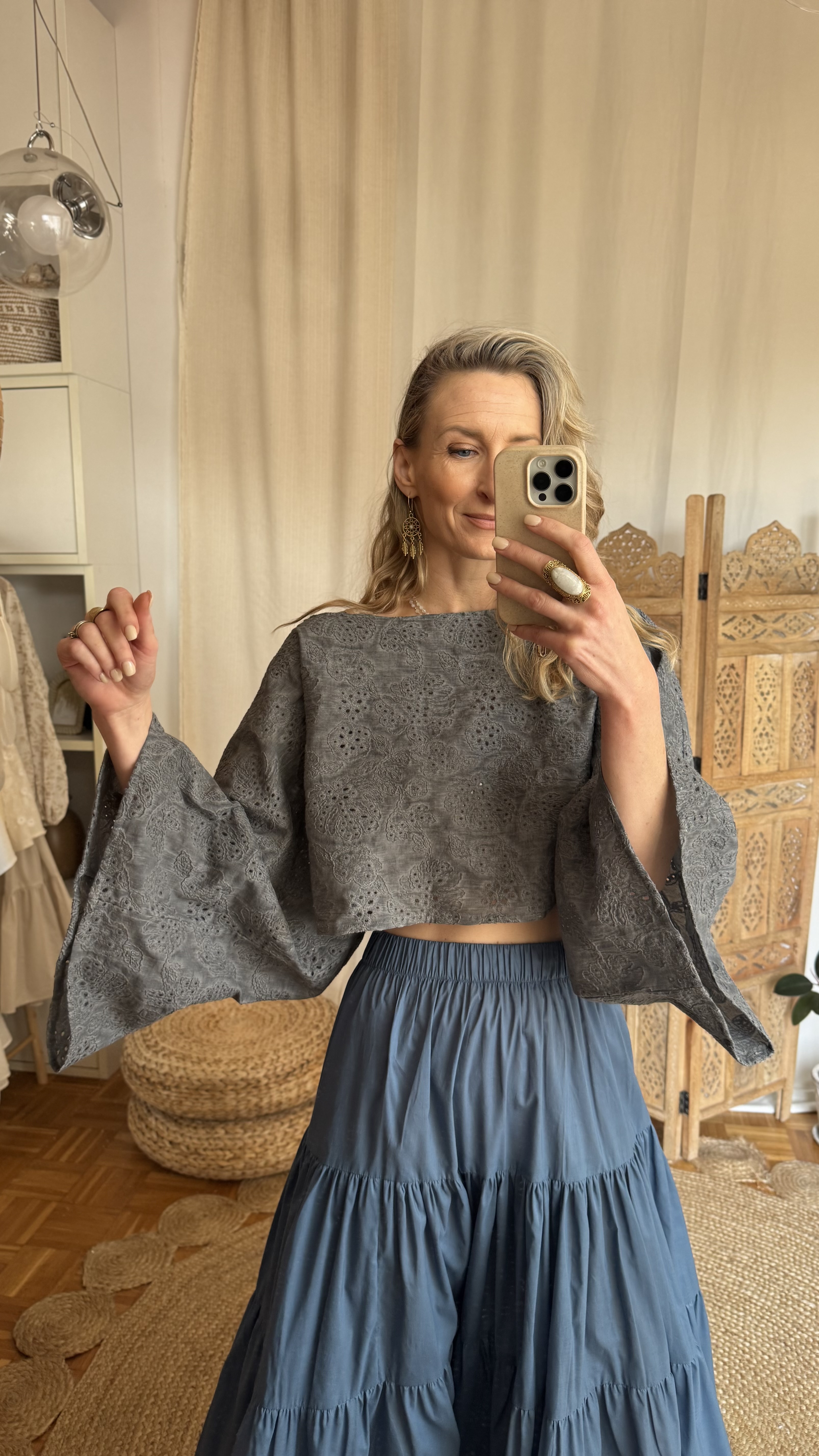 Uszyta z lekkiej, haftowanej bawełny w przepięknym odcieniu szarości.