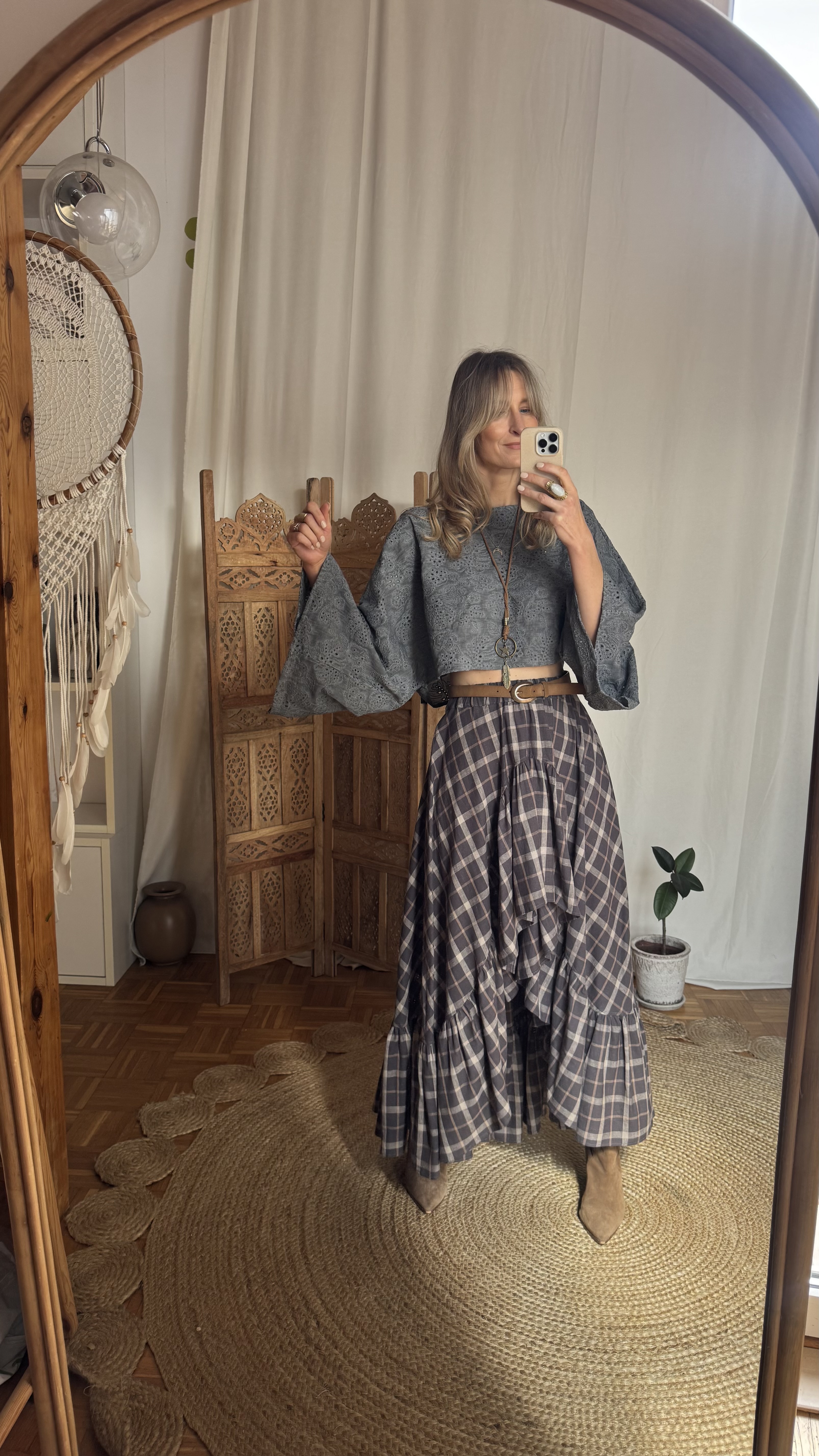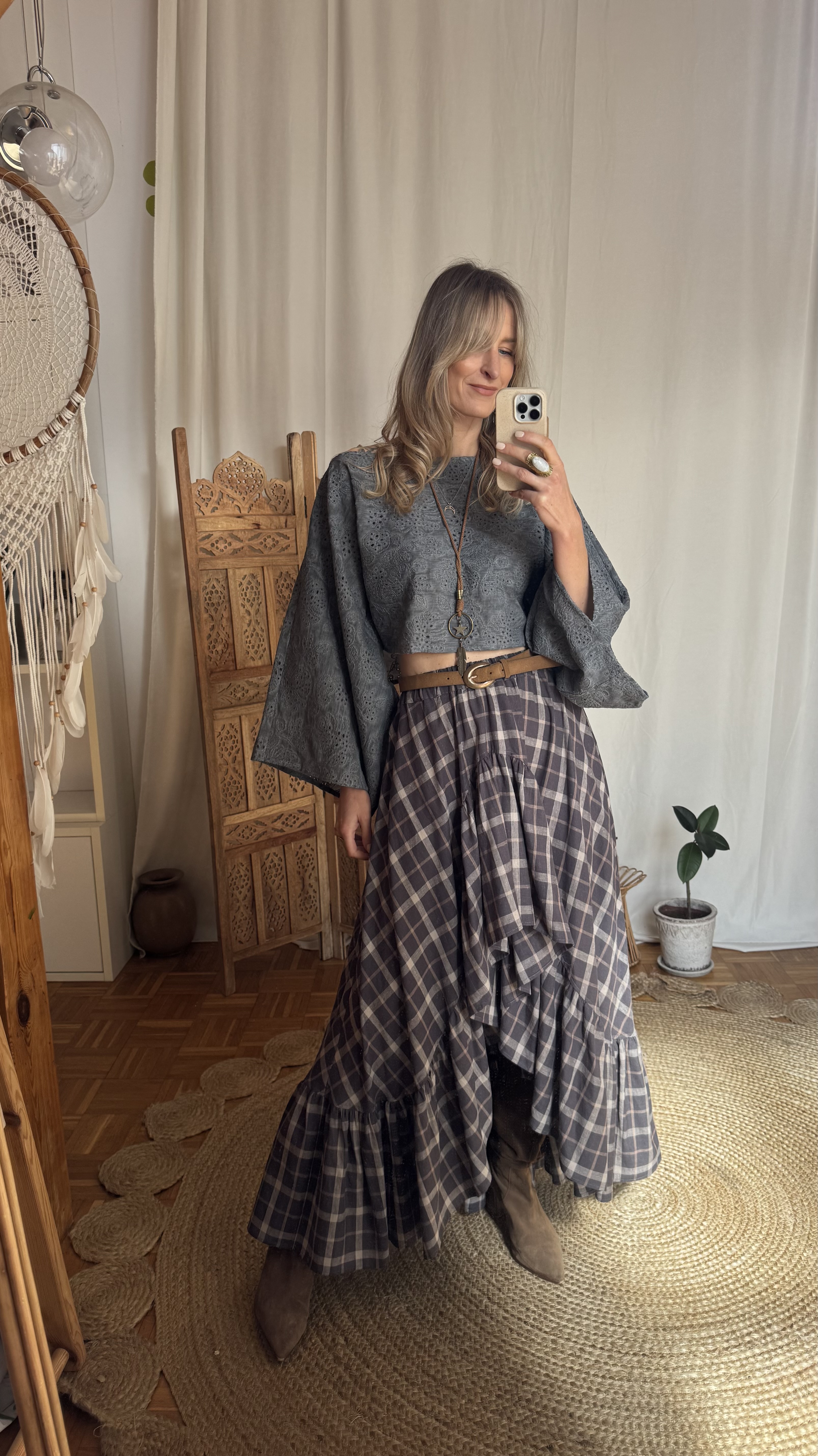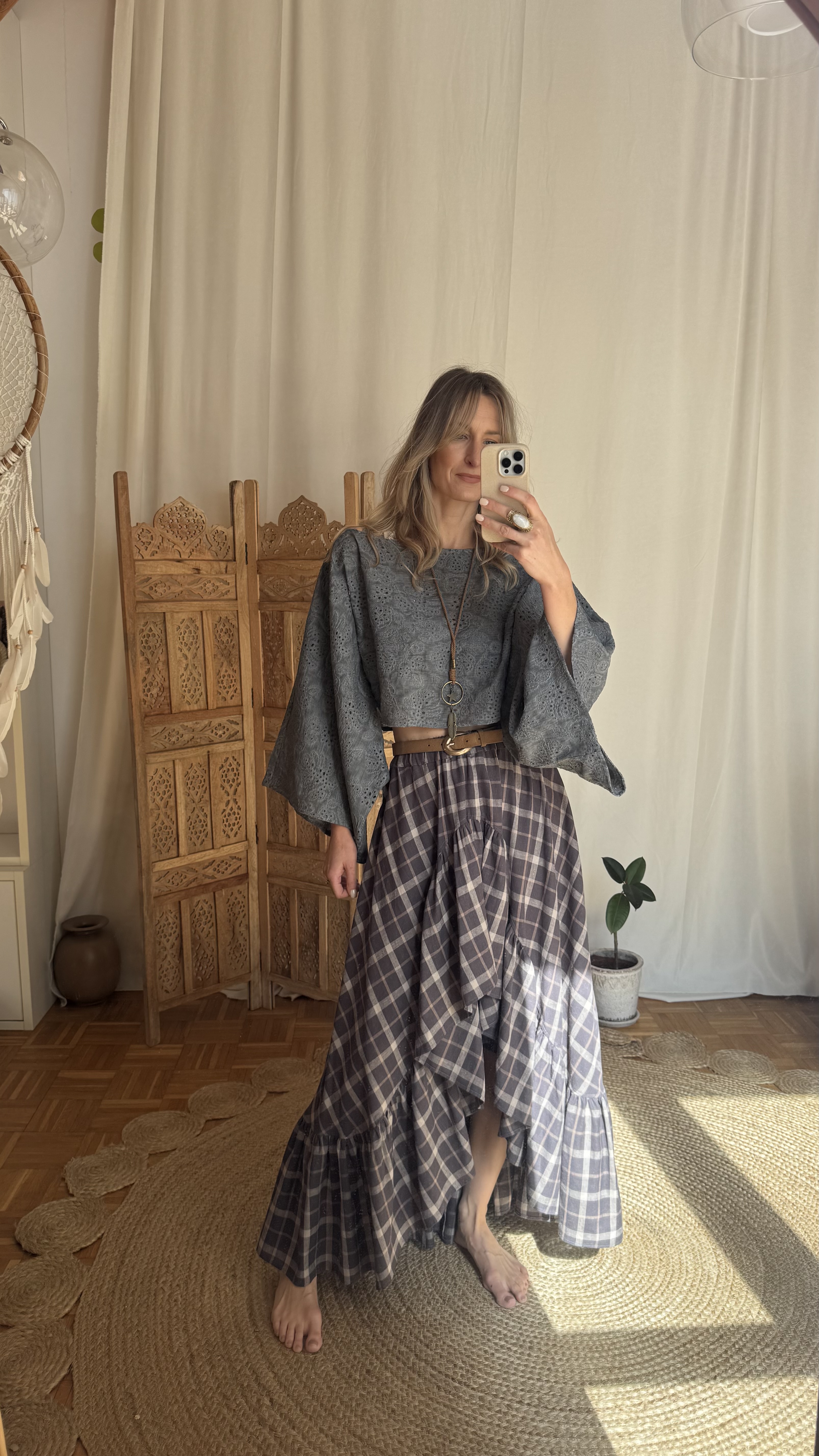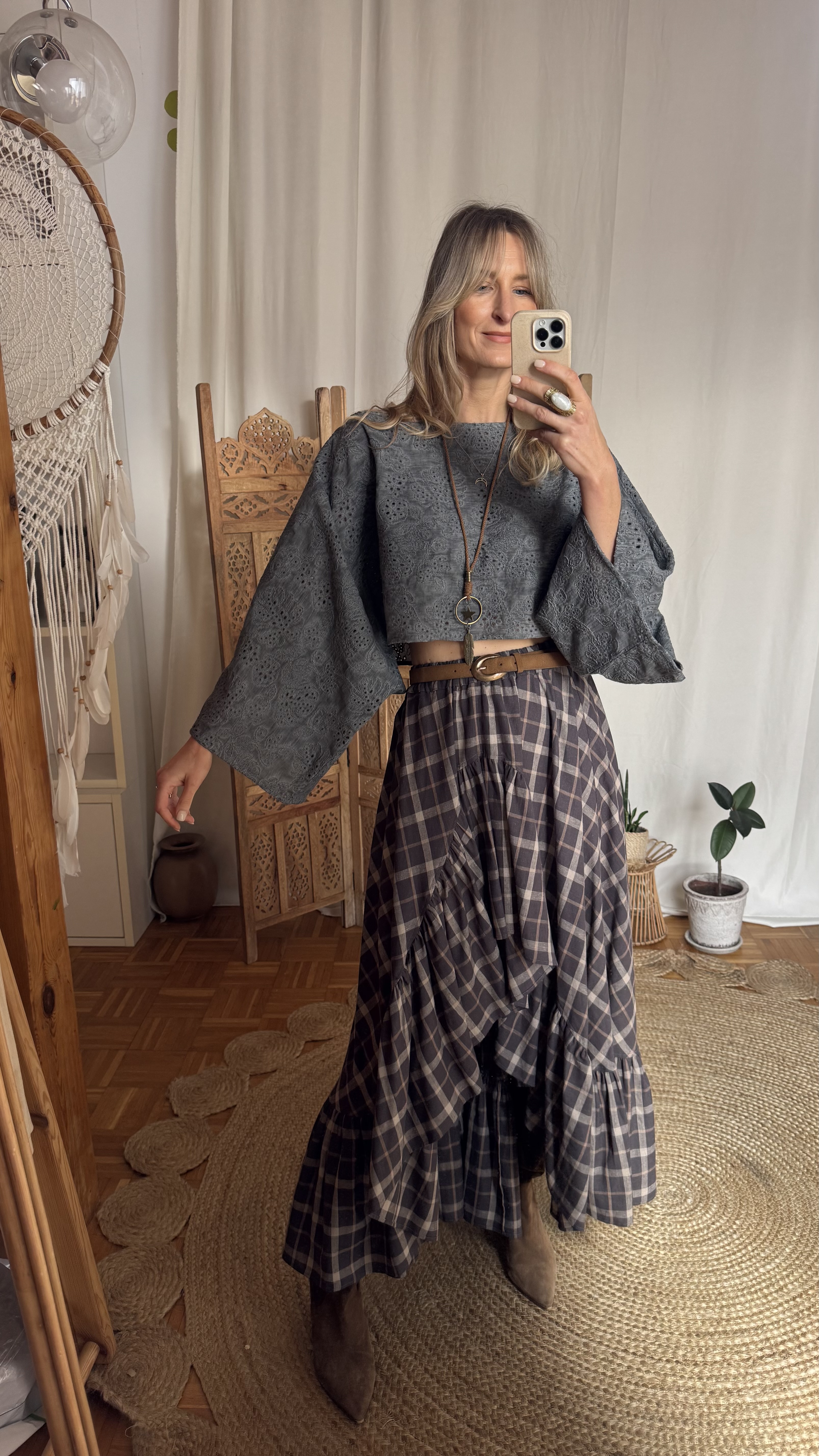 Uszyta z lekkiej, haftowanej bawełny w przepięknym odcieniu szarości.