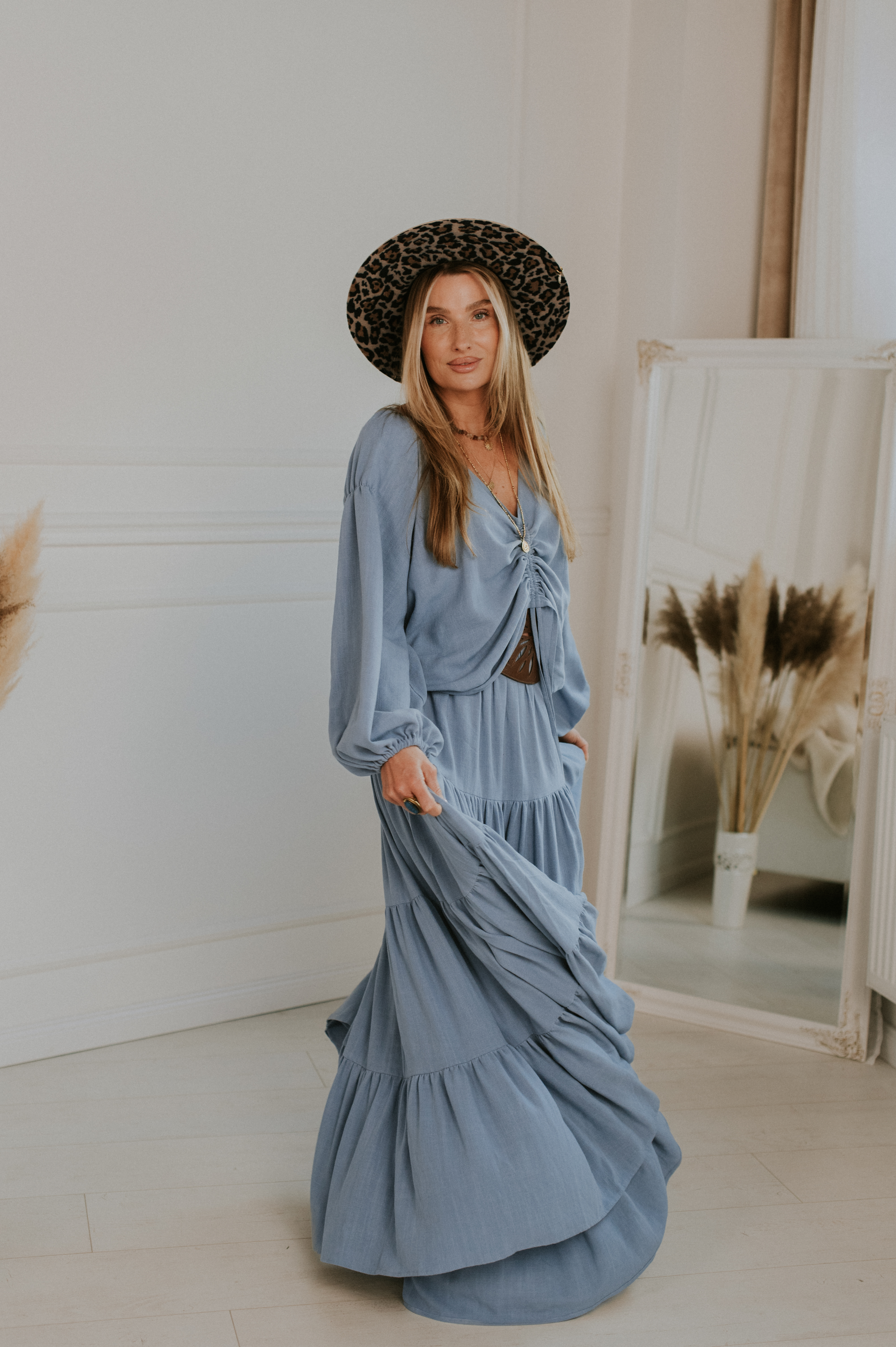 Uszyta z z przyjemnej mieszanki wiskozy i lnu w kolorze baby blue.