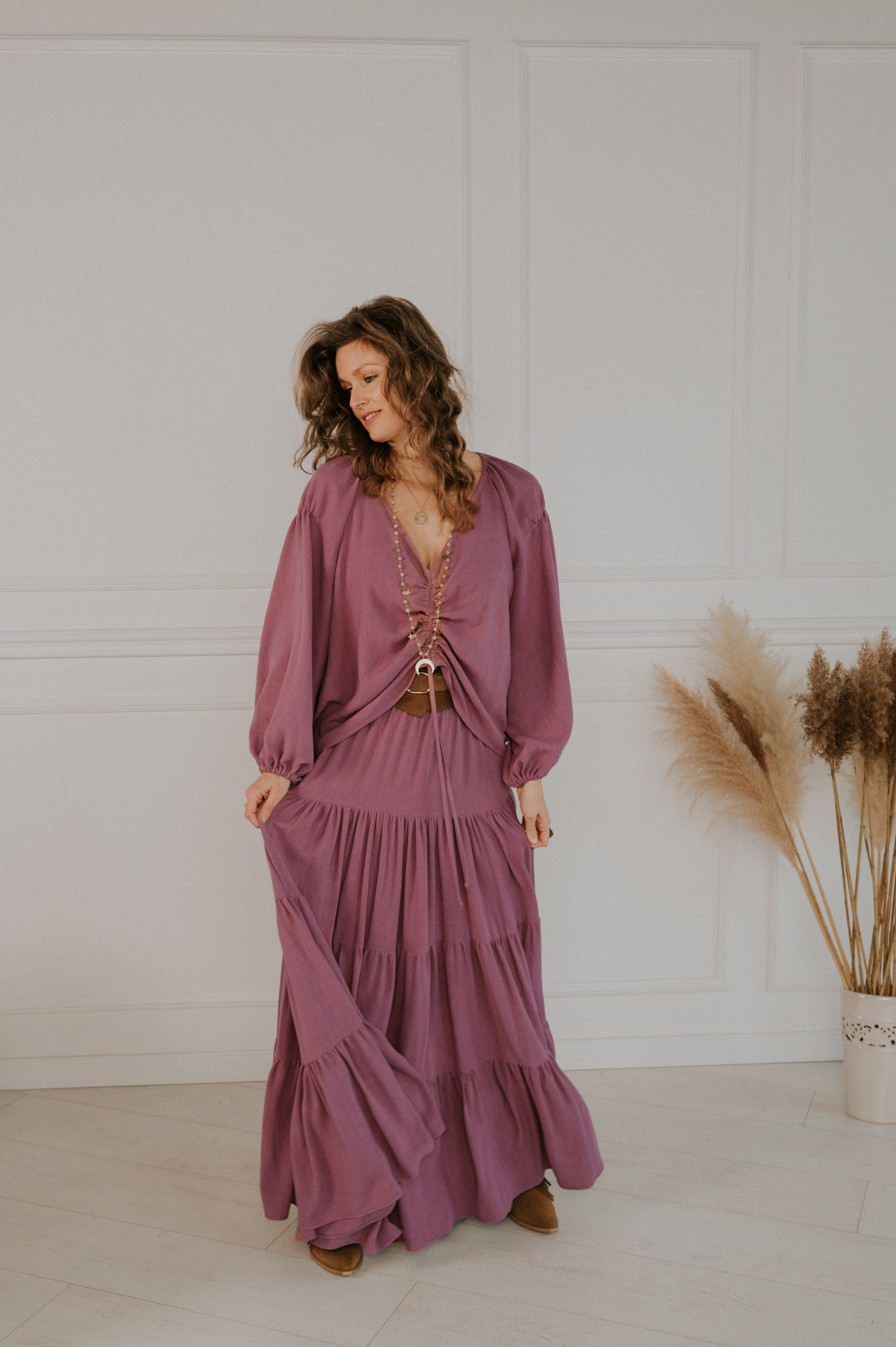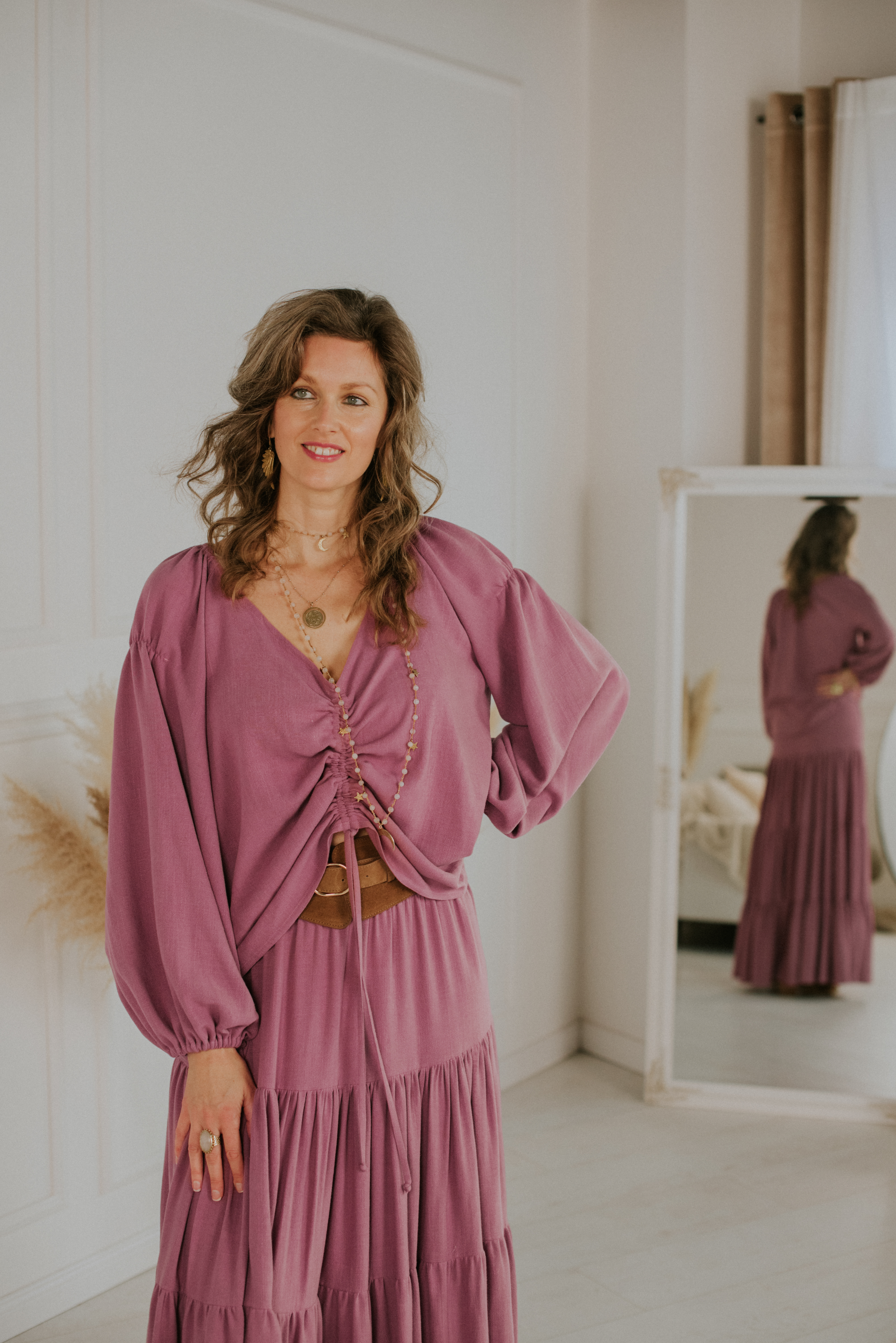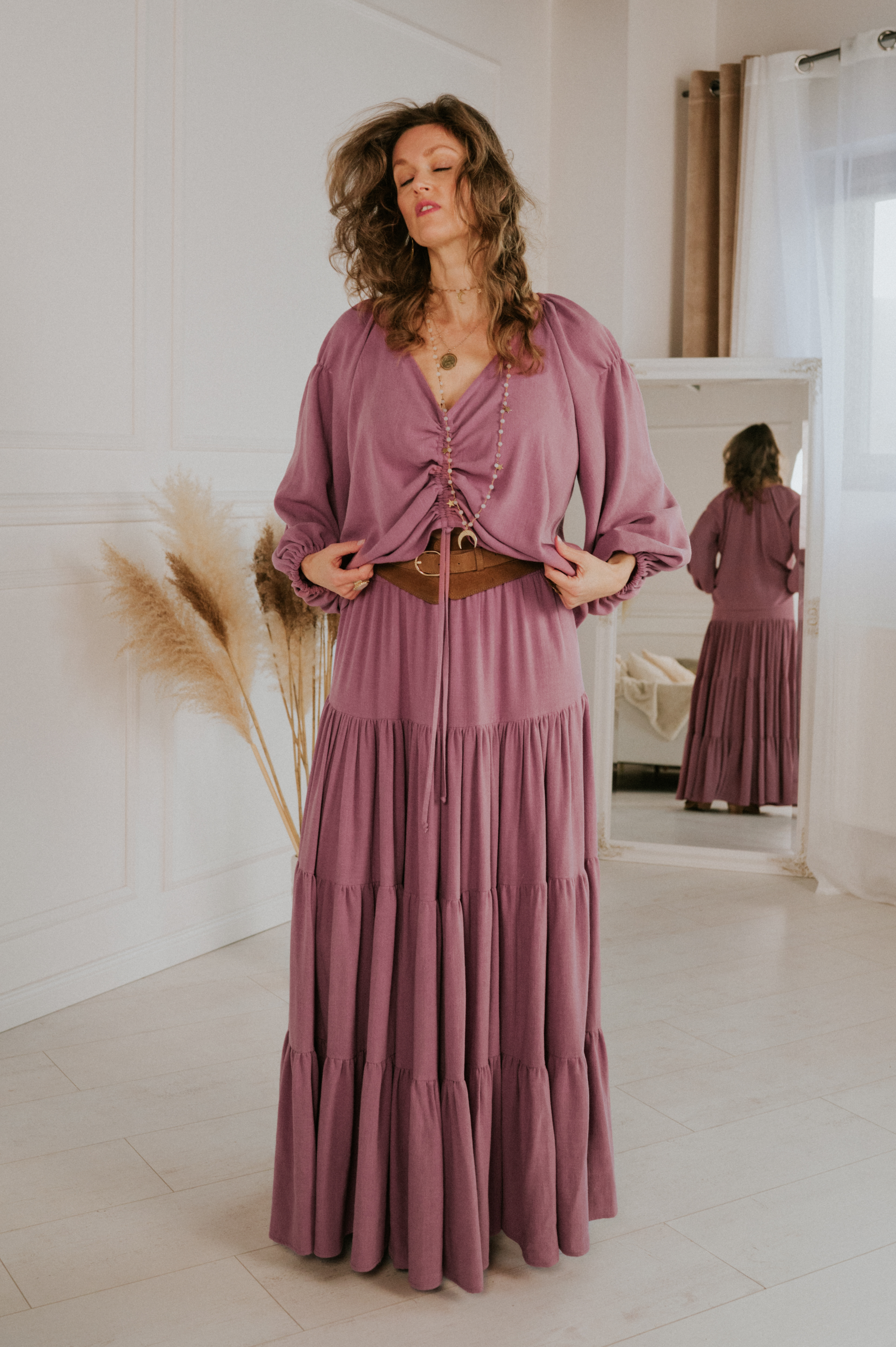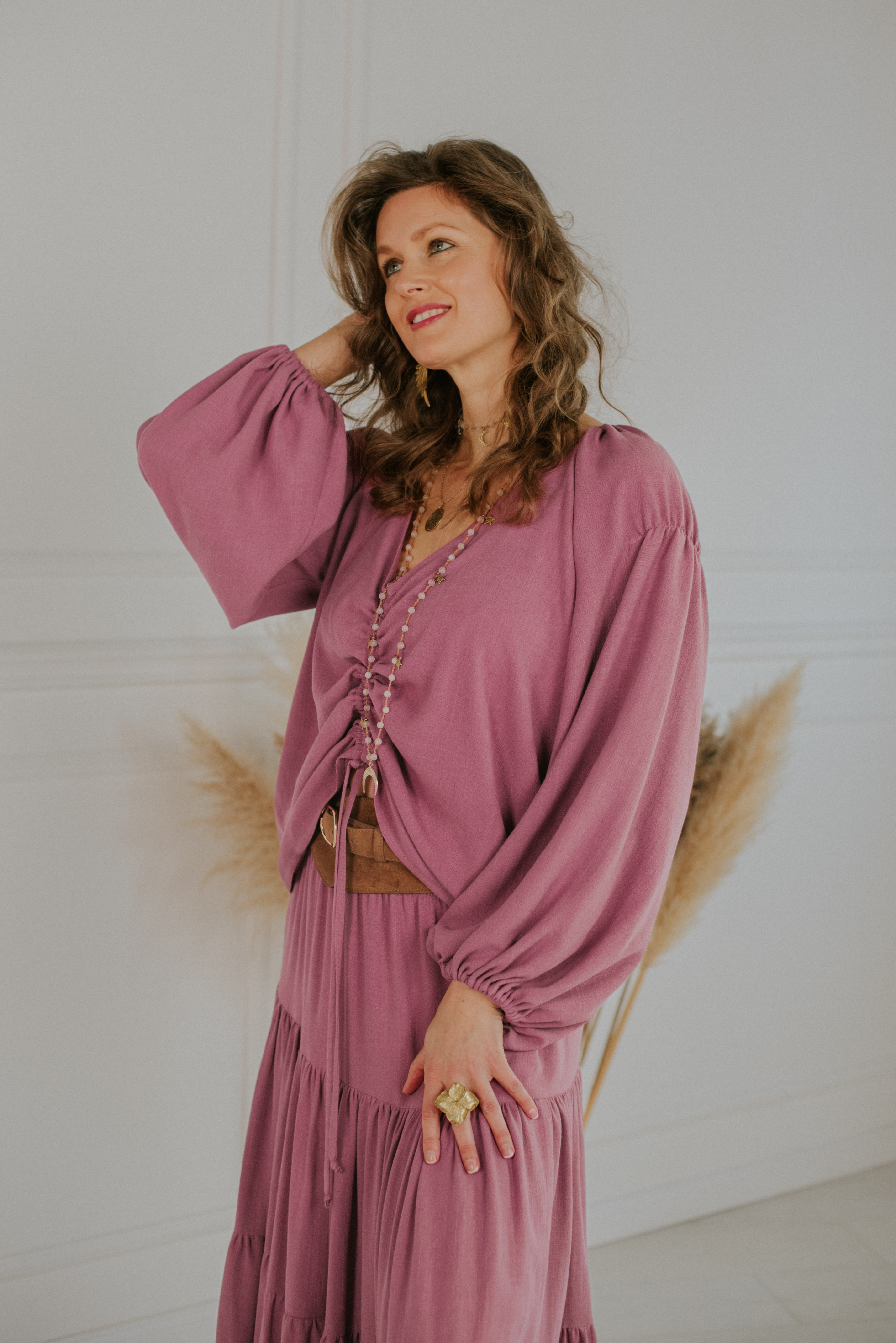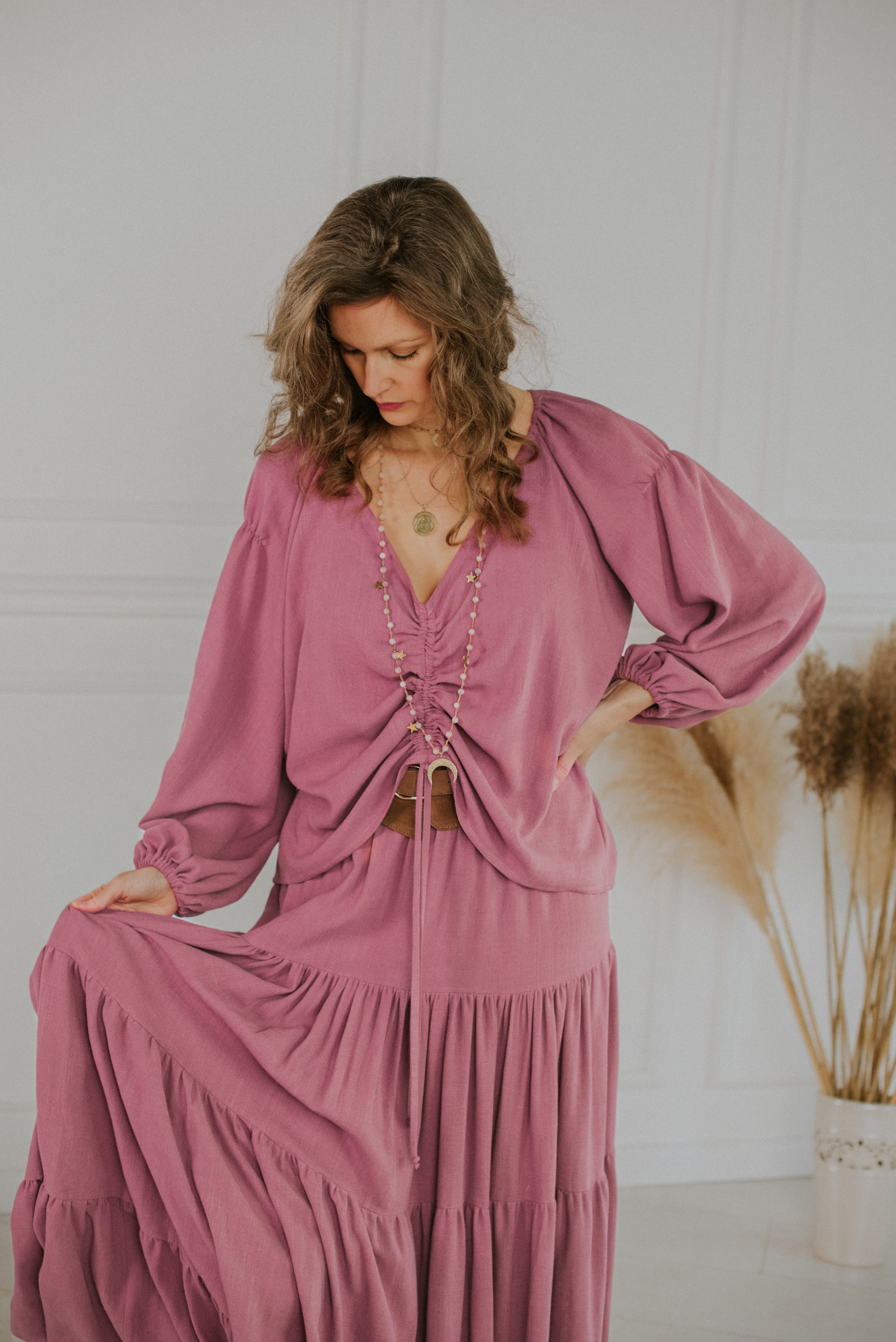 Wykonana z przyjemnej mieszanki wiskozy i lnu w zmysłowym, przygaszonym różu.